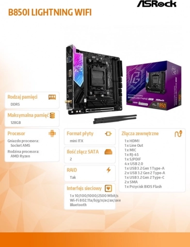 L’ASRock B650I Lightning WiFi est une carte mère mini‑ITX performante et efficace pour les derniers processeurs AMD RYZEN sur socket AM5. Grâce à l’étage d’alimentation 10+1+1 avec SPS 110 A pour le VCore, elle alimente de manière stable même les puces multicœurs puissantes. La plateforme moderne B650 apporte la prise en charge de la DDR5 et des cartes graphiques via PCIe 5.0 x16, vous offrant des performances élevées aujourd’hui et de la marge pour l’avenir.