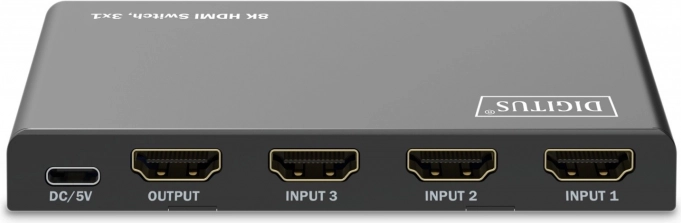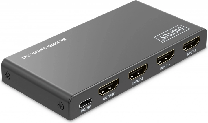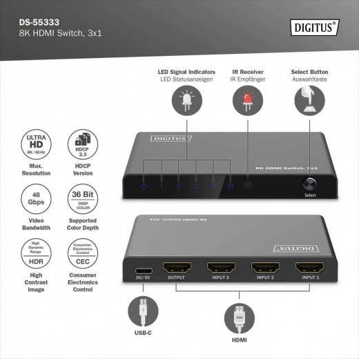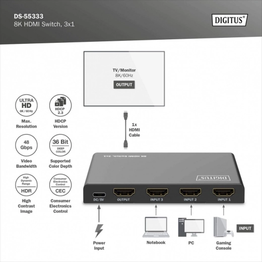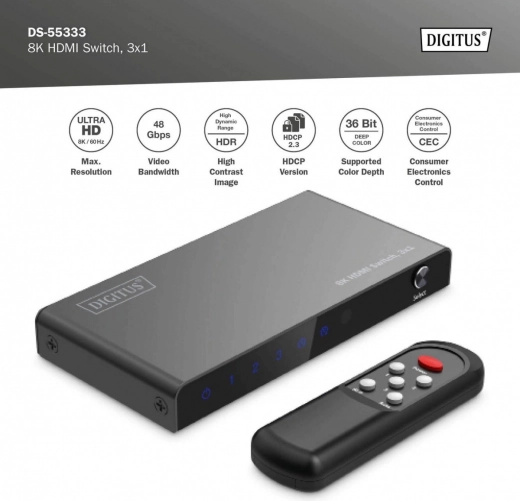 Ajoutez des entrées HDMI supplémentaires à votre téléviseur ou moniteur et basculez entre les appareils sans changer les câbles. Le commutateur HDMI 3×1 de DIGITUS offre une résolution jusqu’à 8K/60 Hz (4:4:4), la prise en charge du HDR et du HDCP 2.3. L’alimentation se fait aisément via USB‑C et le contrôle est assuré par une télécommande ou le commutateur automatique de la dernière source active.
