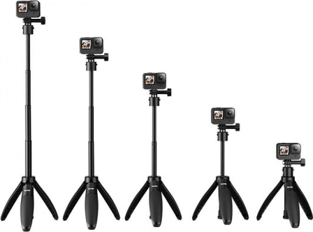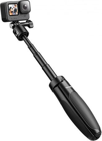 Perche selfie Telesin avec trépied pour caméras sportives. Aluminium, attache rapide, longueur 15–40 cm, base stable, seulement 120 g. Idéale pour vlogs et voyages.