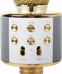 Le microphone est également doté d’un panneau de commande avec des boutons clairs, qui vous permettent de passer et d’arrêter les morceaux, de régler le volume et d’utiliser l’effet d’écho. Il dispose en outre d’une entrée pour carte mémoire permettant d’enregistrer vos chansons.