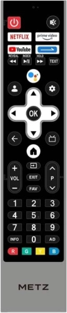 La télécommande ergonomique METZ avec des touches d’accès rapide pour Netflix et YouTube facilite la navigation dans Google TV et le lancement des applications favorites.