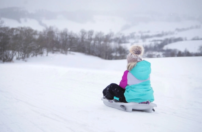 La sécurité avant tout : des freins intégrés assurent un ralentissement fiable et la zone de déformation frontale aide à absorber les chocs. Grâce à son faible poids, la luge se transporte facilement et, avec la corde de traction, vous la remontez sans effort jusqu’au sommet.