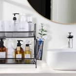 Un organisateur stylé en maille métallique résistante qui aide à exploiter au maximum l’espace vertical sur le plan de travail, dans le garde-manger ou sur la coiffeuse. Les deux niveaux accueillent épices, verres, bouteilles d’huile, sauces, ainsi que cosmétiques et parfums. Le panier latéral est idéal pour les couverts, les ustensiles de cuisine ou les brosses et pinceaux.
