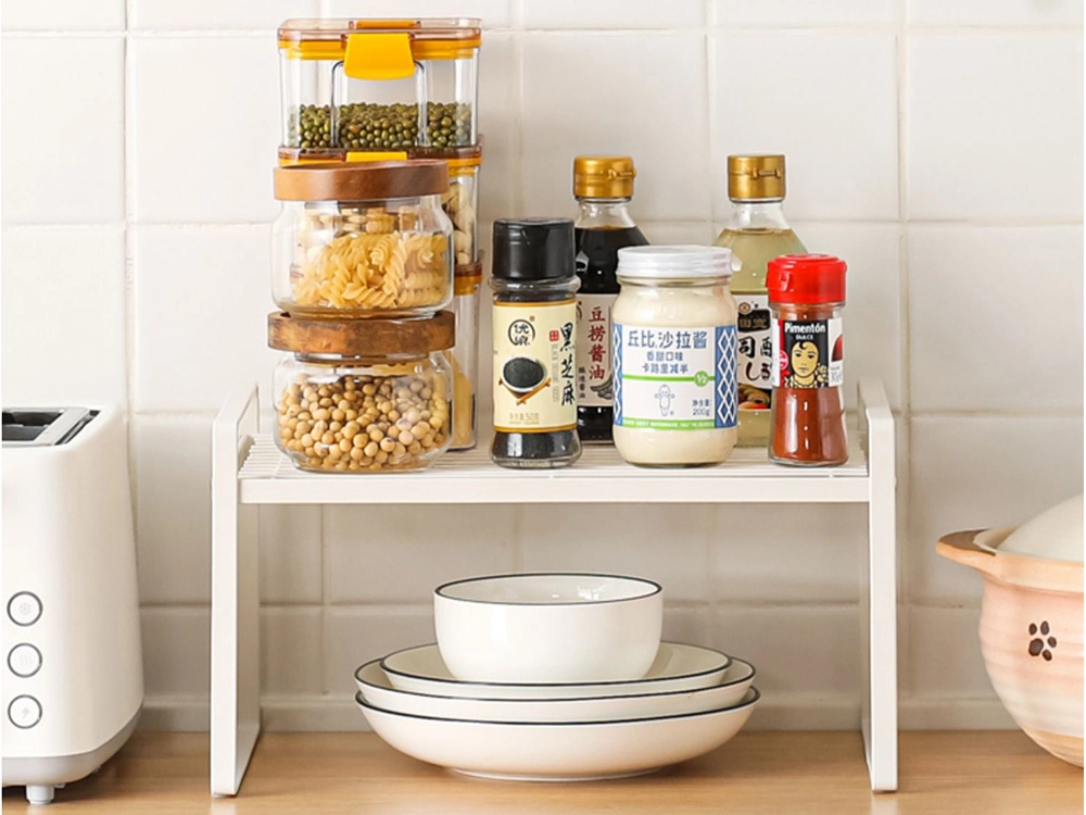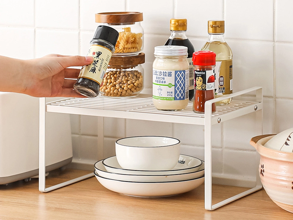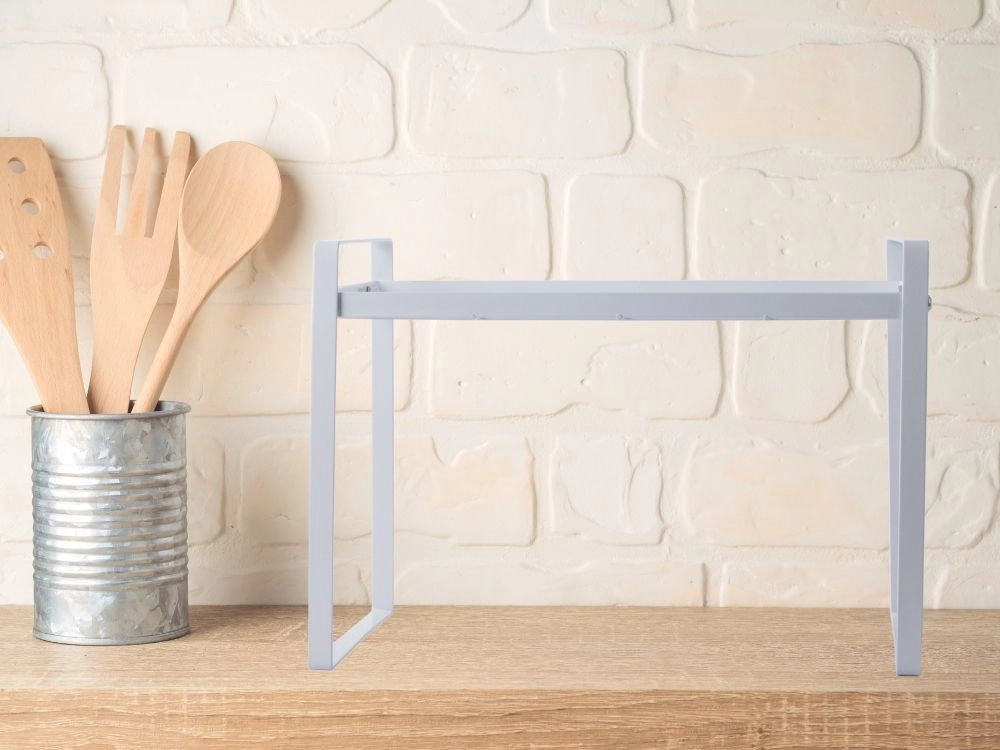La structure surélevée permet de ranger des objets au-dessus et sous l’étagère, exploitant pleinement l’espace vertical sur le plan de travail ou dans l’armoire.