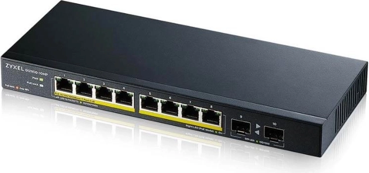 Commutateur Gigabit Zyxel GS1100-10HP est conçu pour un fonctionnement silencieux et économique grâce à sa conception sans ventilateur et au support de la technologie PoE+. Il fournit une performance maximale pour les téléphones IP, les caméras ou les points d'accès sans fil.