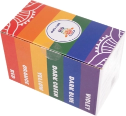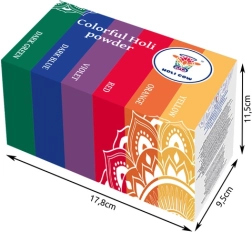 Le pack comprend six teintes éclatantes : blanc, orange, jaune, vert, bleu et violet. Le lot est un excellent choix pour le festival Holi, les fêtes à thème, les team buildings et les actions promotionnelles. La poudre est lavable et s’élimine facilement de la plupart des textiles.