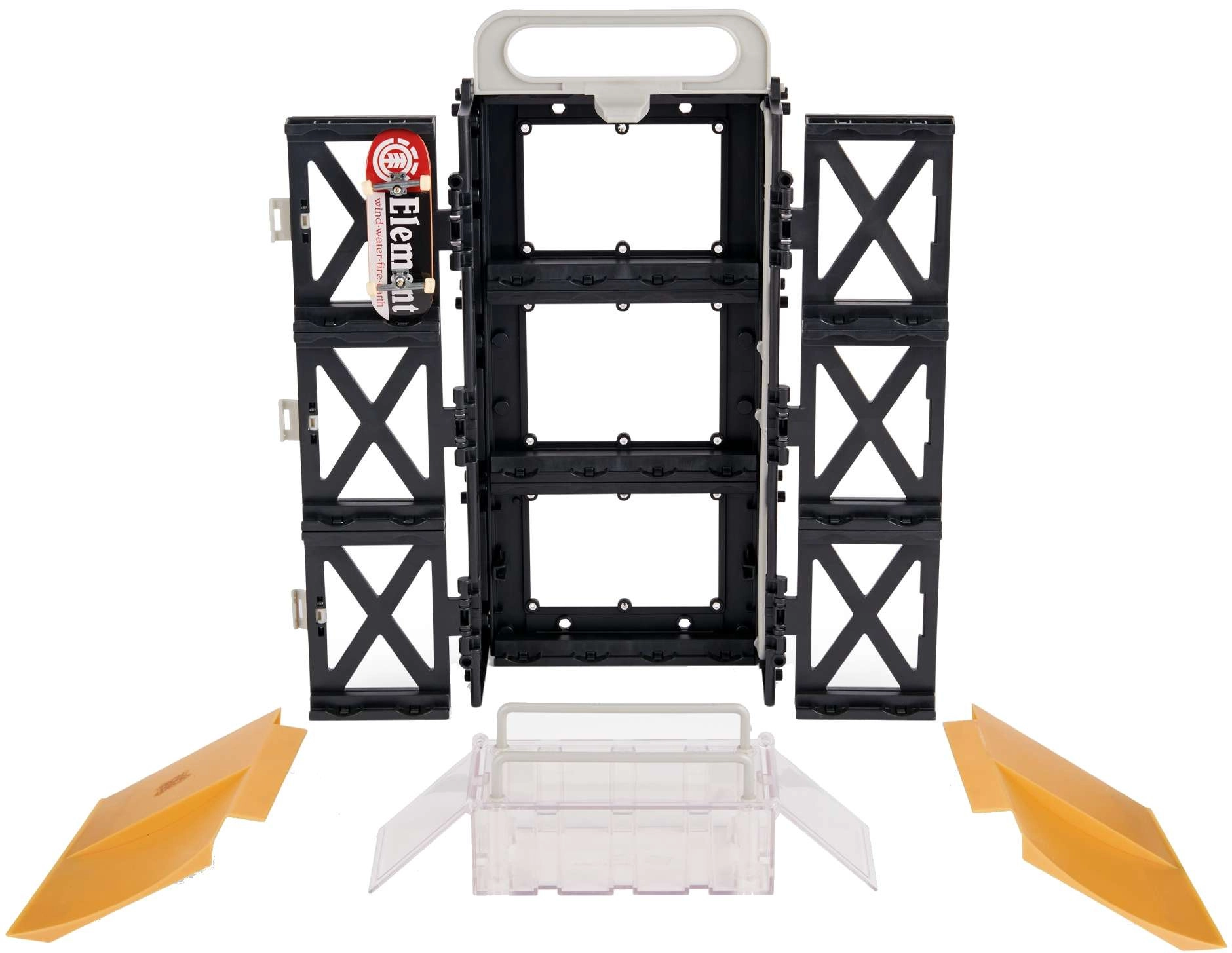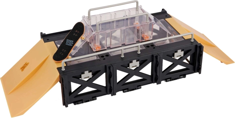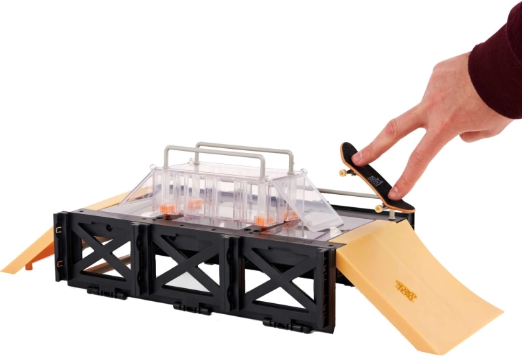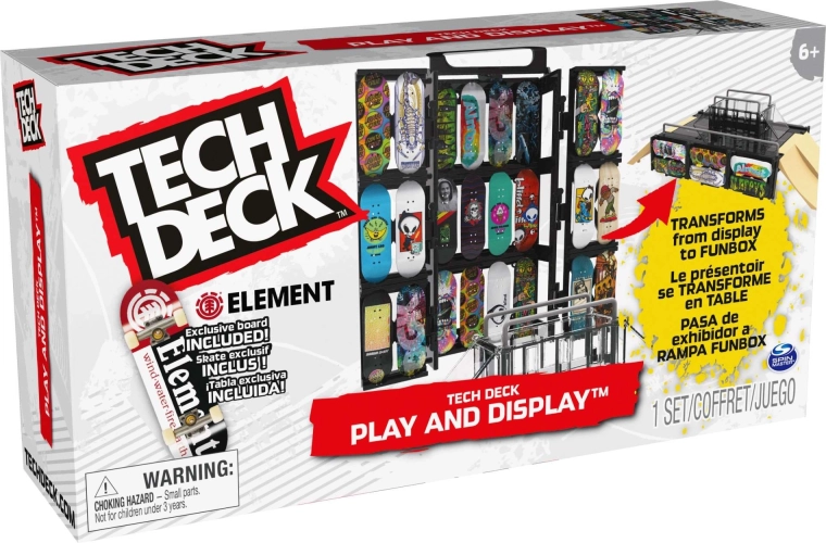 Tech Deck Play and Display est une solution 2-en-1 ingénieuse : présentoir et étui de rangement pour ta collection, ainsi qu’un skatepark fingerboard complet pour les figures. La structure type caisse se déploie facilement en funbox avec rampes et barres de grind, pour rider à la maison comme en déplacement. Un fingerboard stylé ELEMENT est inclus pour rouler immédiatement.