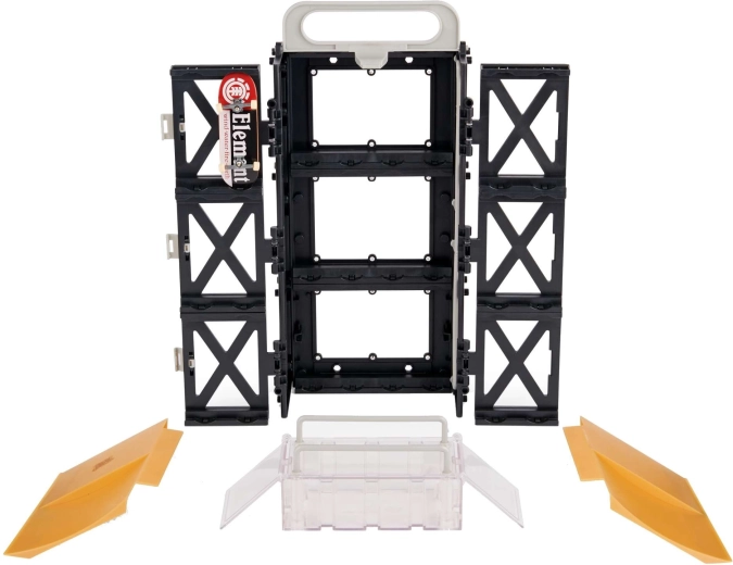 1× fingerboard Tech Deck ELEMENT, 1× étui/pré­sentoir, box avec charnières, 2× kickers rabattables, 4× connecteurs verticaux, 1× kicker droit à double descente, 1× kicker gauche à double descente, 2× barres hautes, 1× longue barre, notice