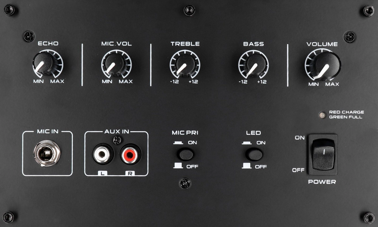 Le confort est assuré par une télécommande et une poignée télescopique avec roulettes pour un déplacement facile. Le microphone intégré pour le karaoké et le panneau LED multicolore apportent l’ambiance idéale à votre fête.