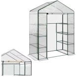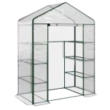 Le modèle comprend 4 étagères latérales et 2 espaces libres au sol, ce qui permet de ranger des pots plus hauts ou de cultiver des plantes grimpantes. La porte zippée facilite l’accès à l’intérieur et la structure avec des raccords en « T » assure un montage rapide et intuitif sans outils.