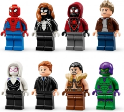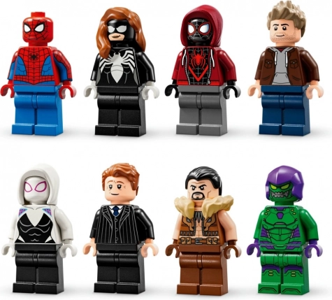 Spider-Man, Spider-Woman, Miles Morales avec sa moto, Eddie Brock, Ghost-Spider, Norman Osborn, Kraven le Chasseur et le Bouffon Vert avec son planeur — tout pour des affrontements épiques entre le bien et le mal.