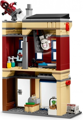 Trois bâtiments distincts — l’appartement de Miles au-dessus d’une bijouterie, la tour Oscorp et l’appartement de Venom au-dessus d’une épicerie — composent un décor urbain vivant pour des aventures d’action et une belle mise en vitrine.