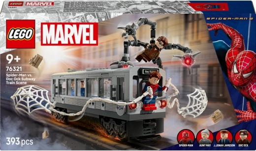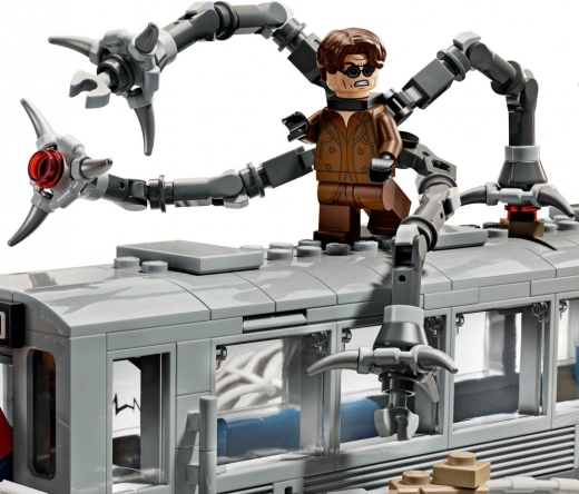 Rejouez la scène culte : Spider‑Man stoppe une rame lancée à toute vitesse avec sa toile tandis que Doc Ock attaque avec ses tentacules mécaniques. De l’action et de la tension à chaque tenon.