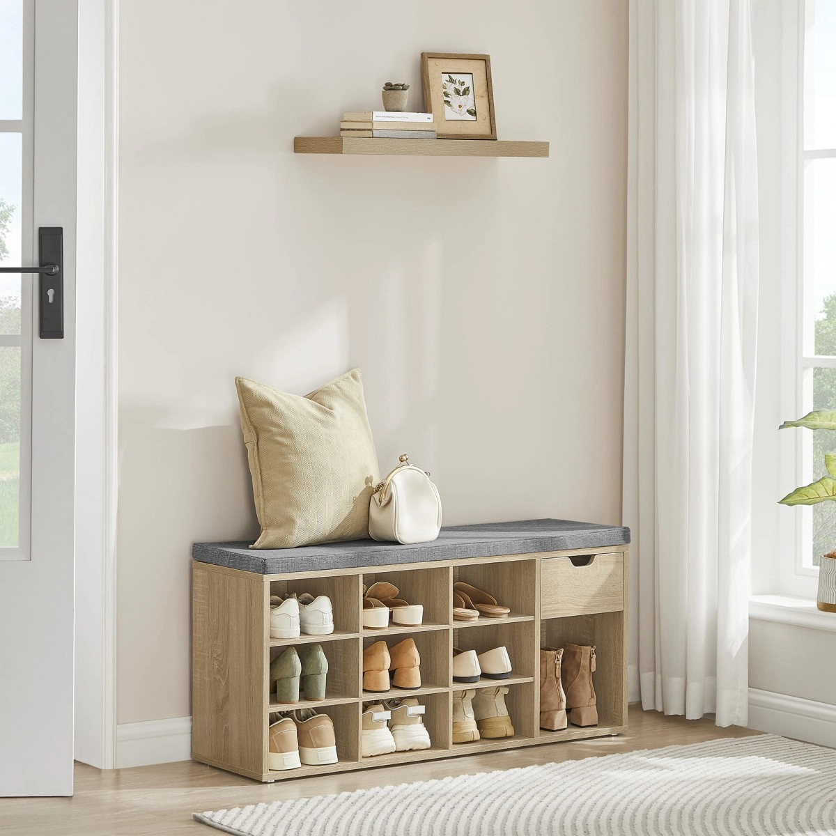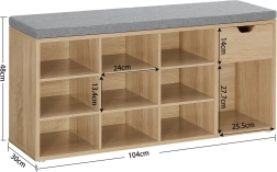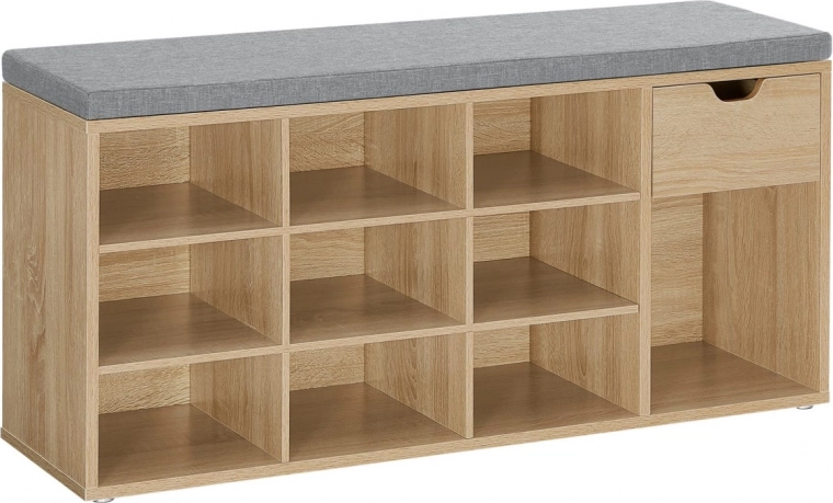 Sur le plateau supérieur se trouve une assise grise moelleuse d'environ 4,5 cm d'épaisseur, fixée au corps du meuble par scratch – vous pouvez ainsi l'enlever et la nettoyer facilement. À l'intérieur, vous trouverez 10 étagères profondes pour des chaussures jusqu'à env. pointure 44 et un espace pratique pour les petits objets. Chaque étagère supporte jusqu'à 10 kg, la capacité de charge totale du meuble est de 200 kg.