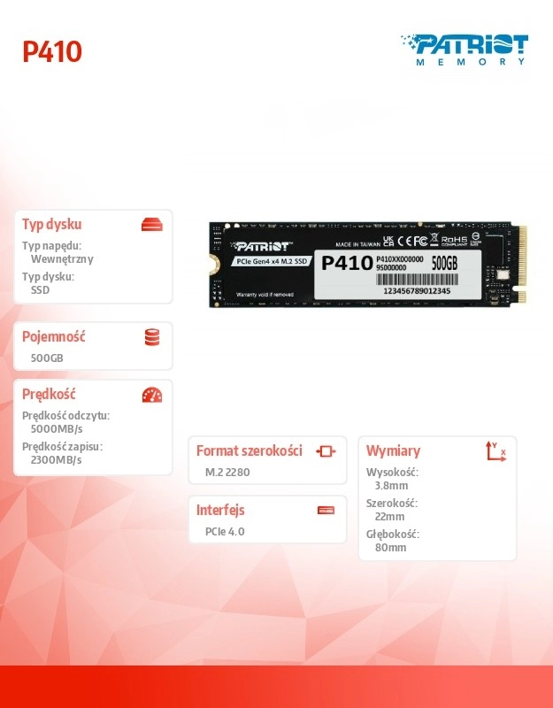 Accélérez votre ordinateur avec le SSD Patriot P410 – un stockage M.2 NVMe Gen4 x4 compact d’une capacité de 500 Go. Il offre des vitesses de lecture élevées jusqu’à 5000 Mo/s et des performances fiables pour des démarrages rapides du système, des jeux et des applications. Grâce à sa faible consommation d’énergie, il prolonge l’autonomie des ordinateurs portables, et son refroidissement efficace avec bouclier thermique en graphène maintient la stabilité même sous charge.