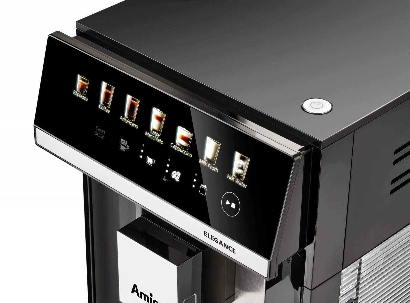 Un panneau intuitif avec icônes tactiles et écran LED facilite le choix des boissons, le réglage de l’intensité et de la quantité de café, ainsi que l’accès aux fonctions HotWater et HotMilk.