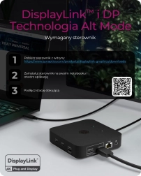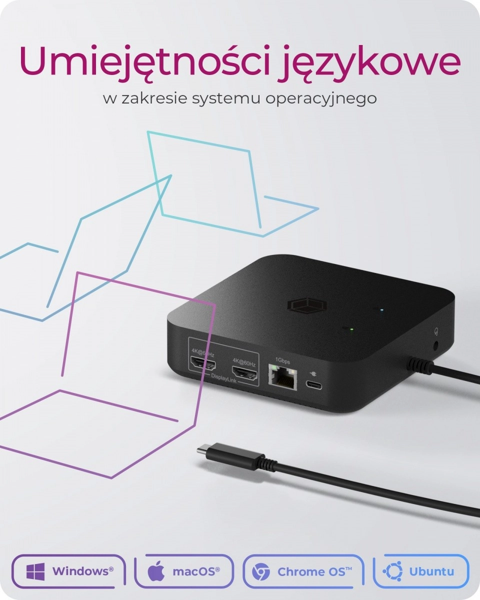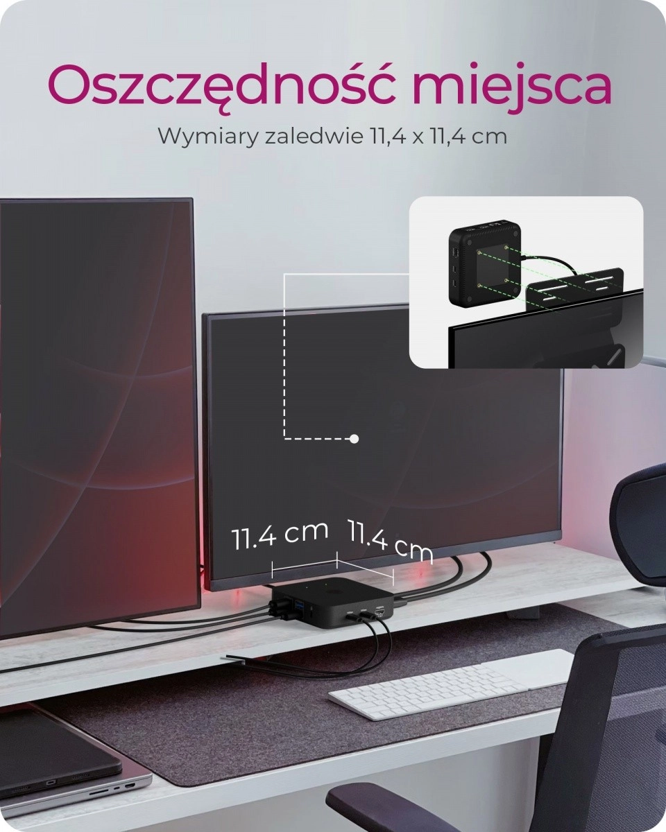 Le boîtier compact de 11,4 × 11,4 cm économise de l’espace sur le bureau et peut être fixé derrière l’écran via un support VESA 50×50 mm (non inclus). Grâce à DisplayLink et au mode DP Alt, vous bénéficiez d’une extension d’affichage flexible, même sur les systèmes ne prenant pas nativement en charge plusieurs écrans externes.