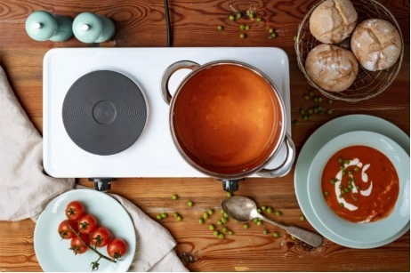La construction robuste en acier est résistante et facile à nettoyer. La régulation de température à cinq niveaux permet d’ajuster précisément le chauffage, du mijotage progressif à l’ébullition rapide. Le témoin de fonctionnement accroît la sécurité, tandis que les pieds en caoutchouc assurent la stabilité sur le plan de travail.