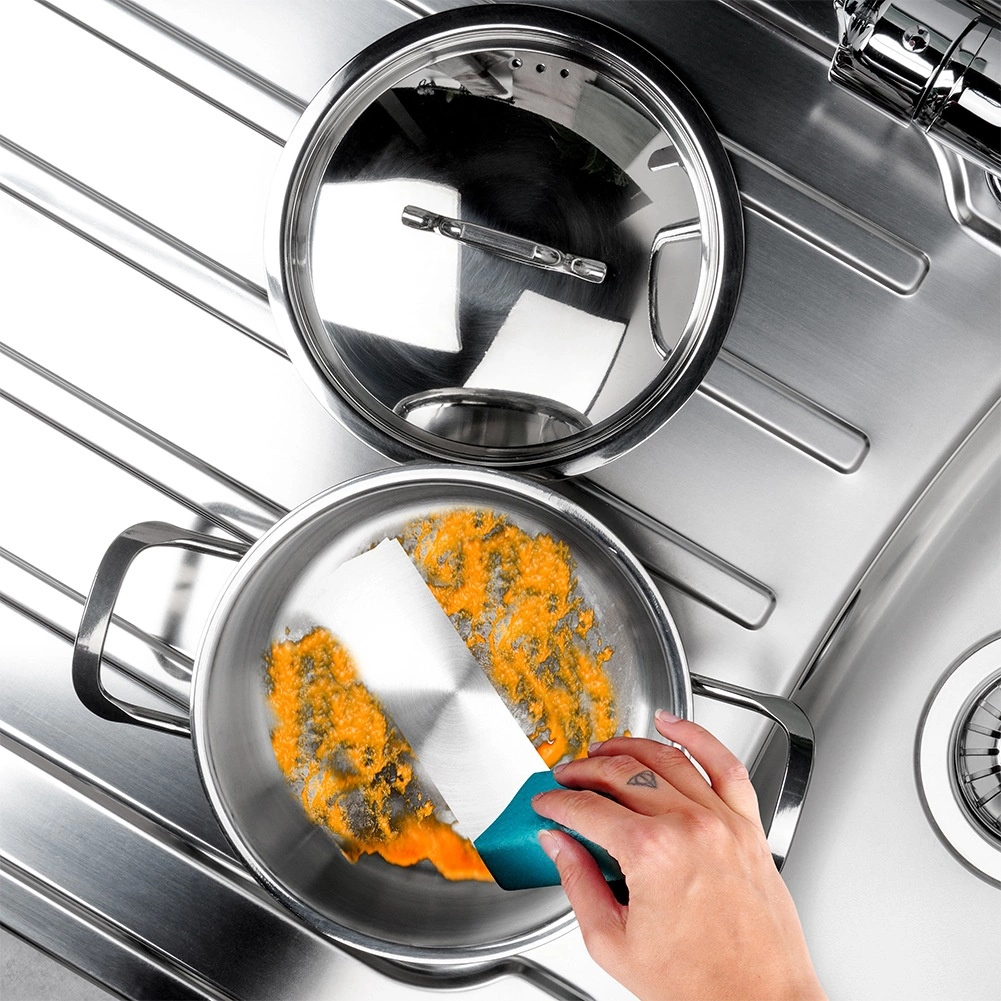 Le fond sandwich robuste accumule et répartit parfaitement la chaleur, ce qui réduit le temps de cuisson et économise de l’énergie sur tous les types de plaques, y compris l’induction.