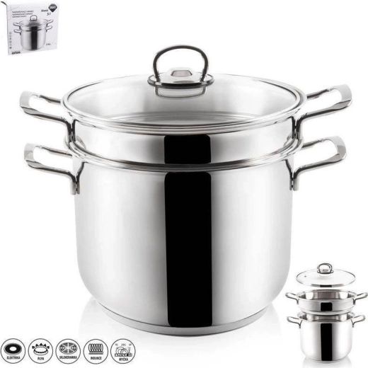 Il comprend un couvercle en verre avec soupape pour une évacuation sûre de la vapeur et un panier vapeur ergonomique à fond perforé avec poignées confortables. L’extérieur est poli à haute brillance pour un look élégant et un nettoyage facile. La casserole est compatible avec tous types de plaques, y compris l’induction, et passe au lave-vaisselle.