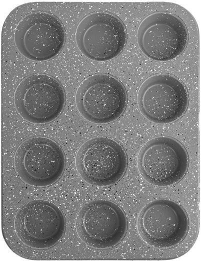 Moule à muffins pratique en granit pour cuire jusqu’à 12 pièces en une seule fournée. Grâce au revêtement antiadhésif en acier au carbone, la pâte n’attache pas et la cuisson est facile même avec un minimum de matière grasse. Le moule est résistant jusqu’à 230 °C, adapté aux fours à gaz et électriques, et peut être lavé au lave-vaisselle – idéal pour les muffins maison, cupcakes, mini desserts et biscuits.