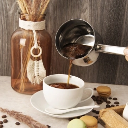 Elle est idéale non seulement pour préparer un café parfumé, mais aussi pour chauffer le lait ou de petites quantités de sauces. La poignée ergonomique tient bien en main pour une manipulation sûre et confortable. La cezve est compatible avec les plaques à gaz, électriques et vitrocéramiques et peut être lavée au lave-vaisselle.