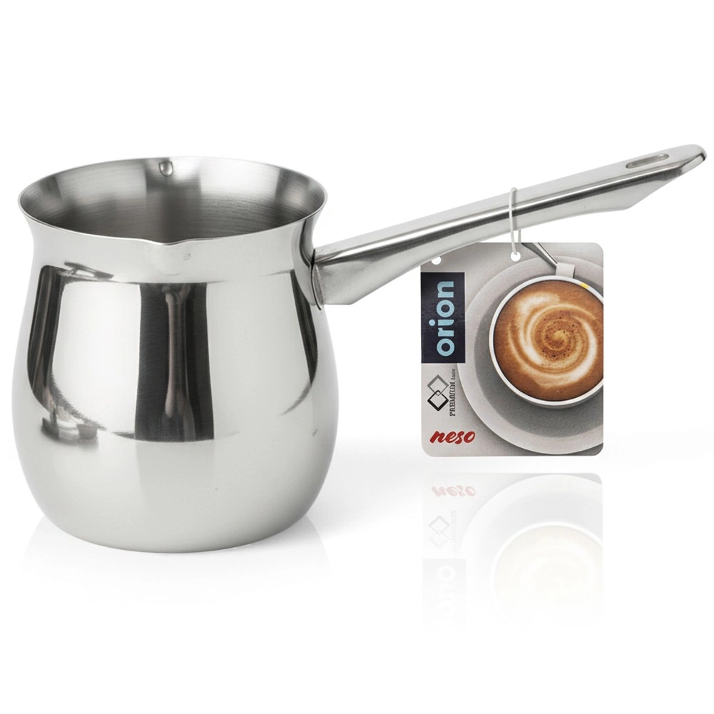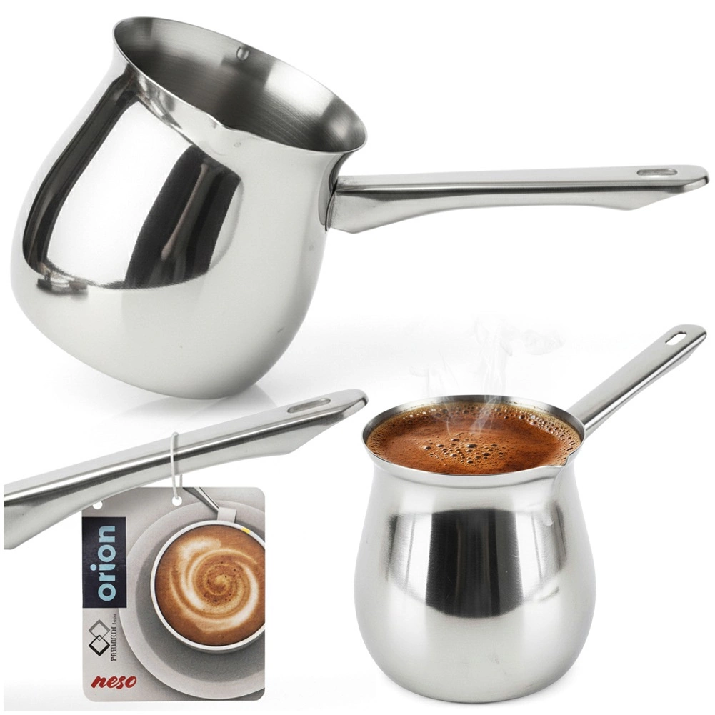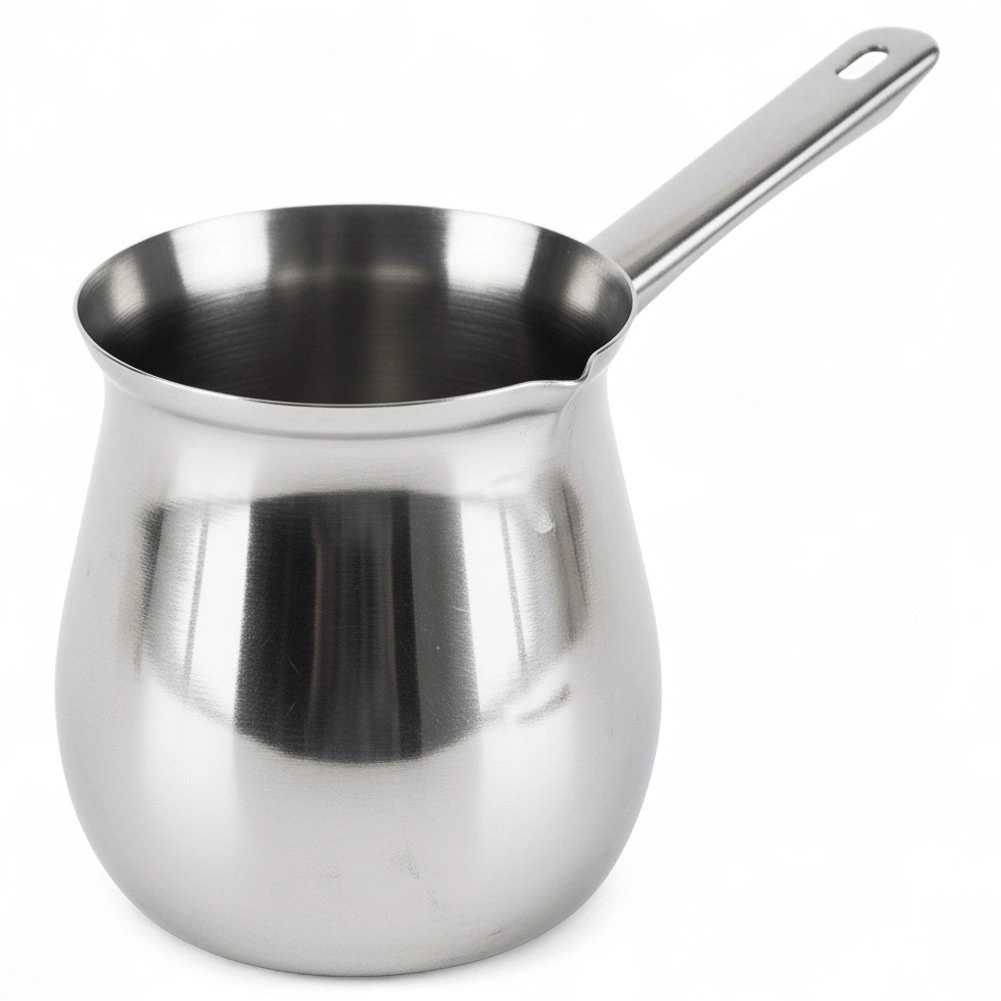 Cezve (djezva) en acier inoxydable de 600 ml pour la préparation du café turc et pour chauffer le lait. Équipée d'une poignée ergonomique, d'un bec verseur pratique pour un service précis et d'un collier anti-débordement spécial. Compatible avec les cuisinières à gaz, électriques et vitrocéramiques et lavable au lave-vaisselle. Fabriquée en acier inoxydable de qualité apte au contact alimentaire.