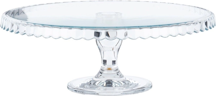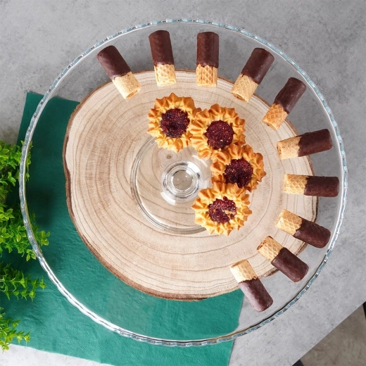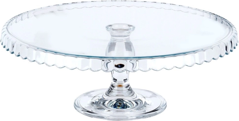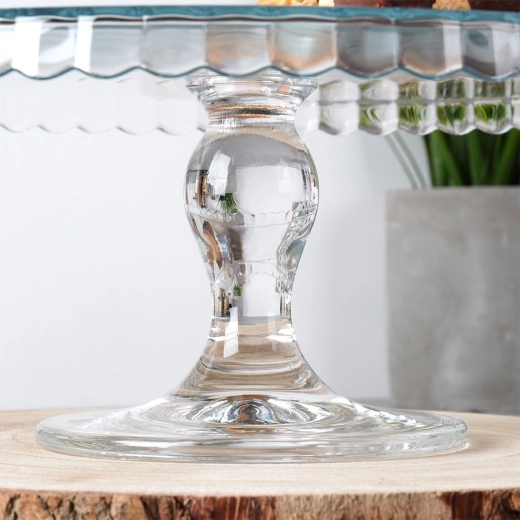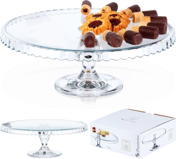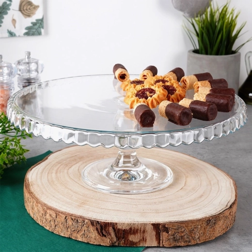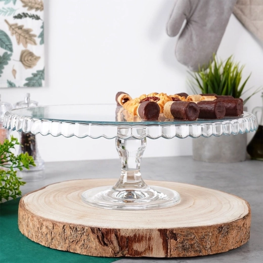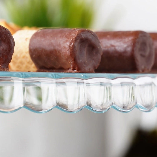 Exposez gâteaux, tartes, cupcakes ou canapés avec style. Le verre transparent du plateau met en avant les couleurs et textures de vos desserts, tandis que la colonne surélevée assure une découpe et un service confortables. Le bord ondulé apporte une touche décorative à toute table.