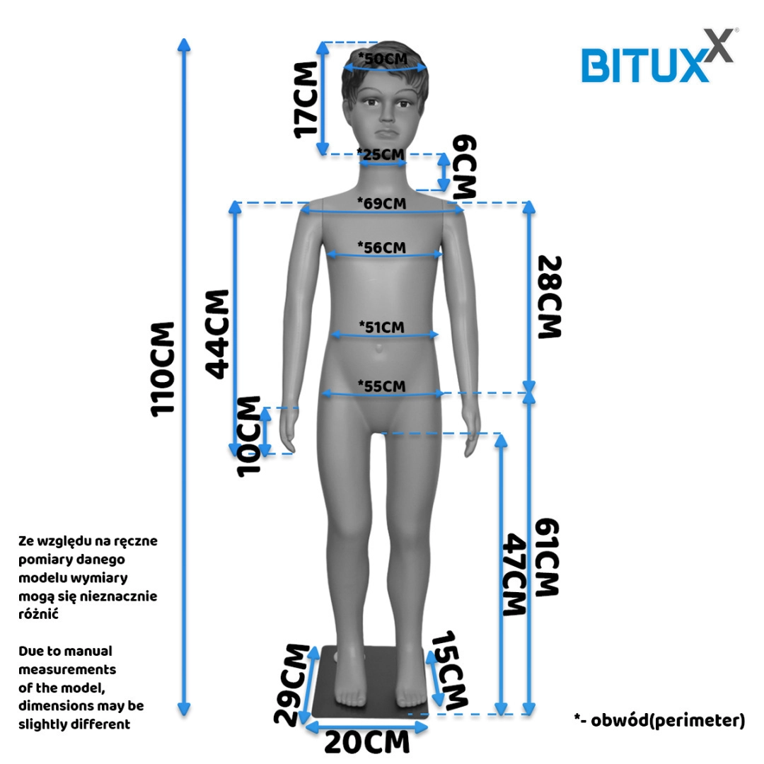 Ce mannequin enfant d’environ 110 cm se distingue par son apparence naturelle : visage, cheveux et mains finement détaillés attirent l’attention et augmentent l’attrait de l’exposition. Le matériau en polyéthylène résistant est léger, robuste et facile à nettoyer, parfait pour une utilisation quotidienne en retail.