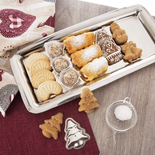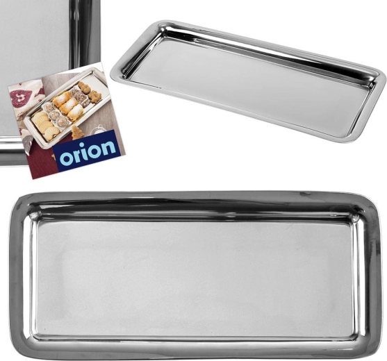 Plateau rectangulaire pratique en acier inoxydable de qualité, au look argenté élégant. Parfait pour servir des canapés, bouchées, entrées, biscuits et desserts. Grâce au bord rehaussé, la manipulation est aisée et les aliments restent bien en place.