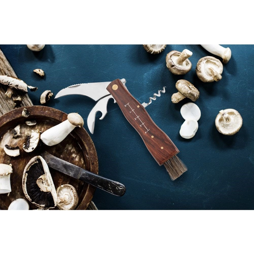 Découvrez un couteau à champignons fiable en acier inoxydable de qualité avec un manche en bois confortable. Sa lame spécialement profilée et incurvée de 8 cm permet une coupe délicate, une bonne prise et un pré-nettoyage directement sur place. Le pinceau intégré élimine facilement sable et terre, tandis que la règle 1–4 cm marquée sur le manche aide à évaluer rapidement le diamètre des prises.