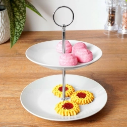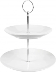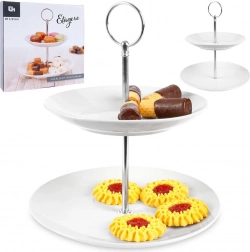 Ce présentoir en porcelaine à deux niveaux, dans un blanc intemporel, complète parfaitement toute table. Créez un sweet bar stylé ou servez élégamment fruits, macarons, biscuits ou amuse-bouches salés. La structure stable avec colonne centrale métallique et poignée pratique permet un transport sûr, même lorsque le support est bien garni.