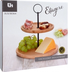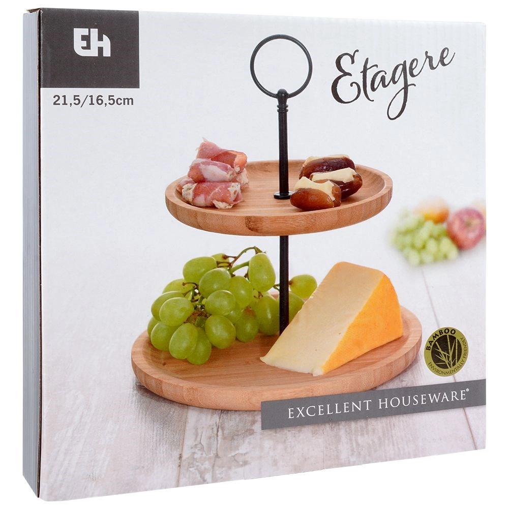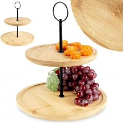 Élégant plateau à deux niveaux en bambou d’une hauteur de 24 cm pour un service et une présentation stylés des desserts, fruits et snacks. Le bambou naturel et les éléments métalliques noirs assurent un look moderne et une grande durabilité. Grâce aux deux bols de tailles différentes, créez facilement un arrangement spectaculaire, gagnez de la place sur la table et transportez le tout aisément grâce à la anse pratique. Entretien facile – il suffit d’essuyer avec un chiffon humide (ne pas laver au lave-vaisselle).