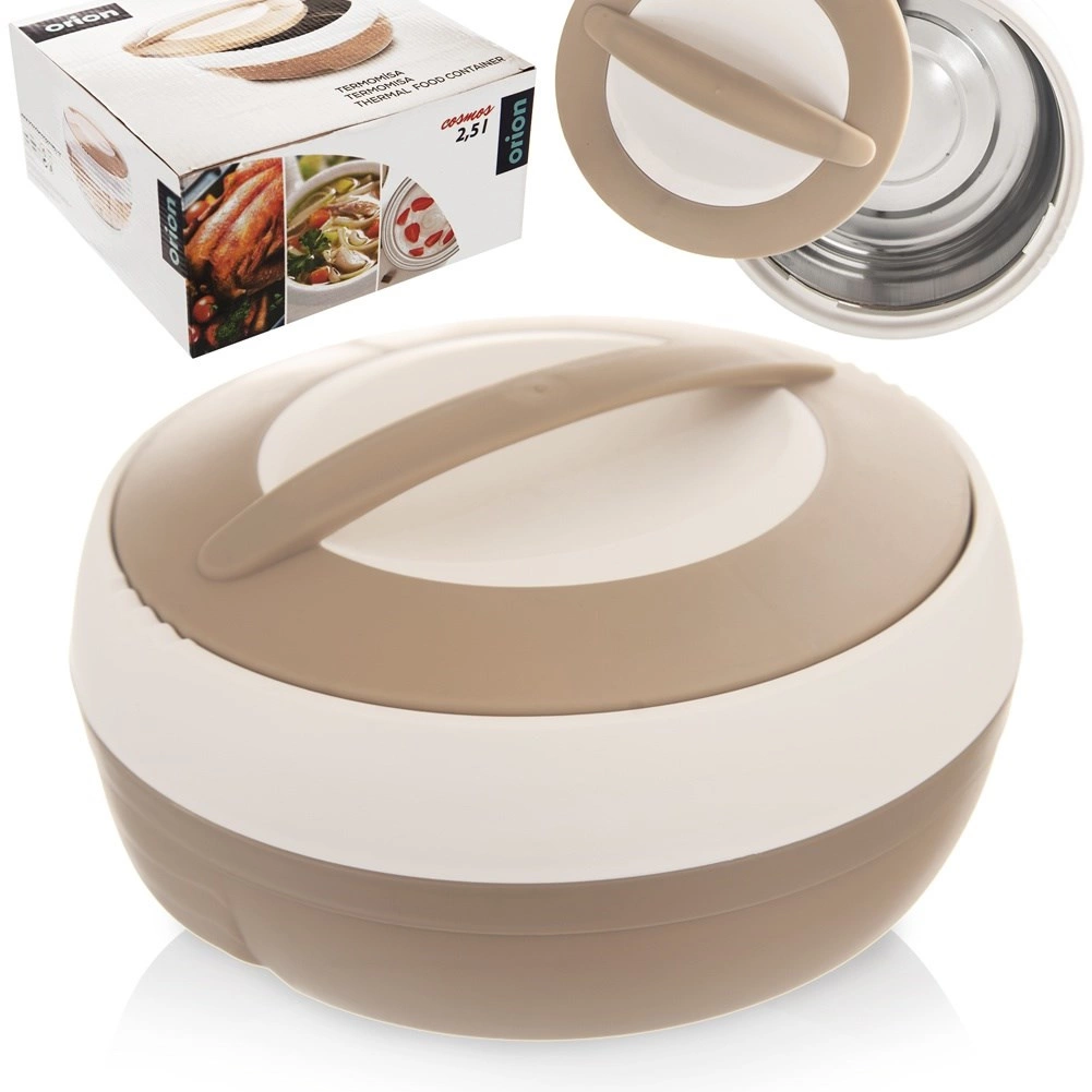 Bol isotherme pratique de 2,5 l pour conserver des plats chauds et froids. Grâce à la paroi intérieure en acier inoxydable et à la fermeture facile par couvercle avec poignée, il garde les aliments chauds jusqu’à 2 heures. Léger, résistant et idéal pour le transport de déjeuners, soupes et desserts. Produit original de la marque ORION.