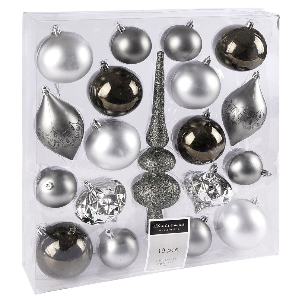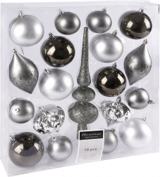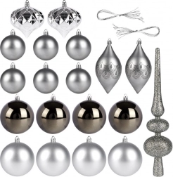 Élégant set de 19 décorations de Noël dans des tons argent et graphite pour décorer rapidement et avec style votre sapin. Il combine des finitions mates, brillantes et pailletées, et inclut une pointe scintillante (30 cm). Les décorations sont en plastique de qualité incassable, sûres pour les foyers avec enfants et animaux, tout en imitant fidèlement le verre.