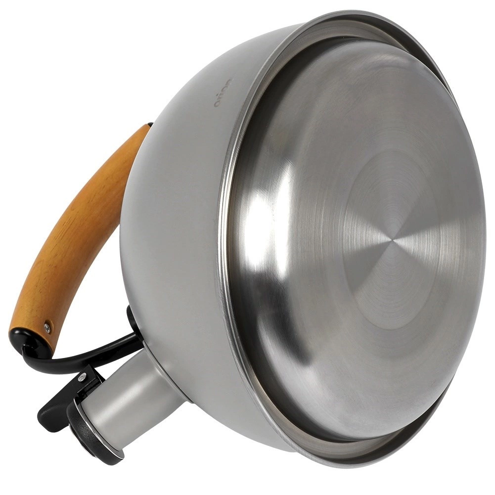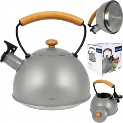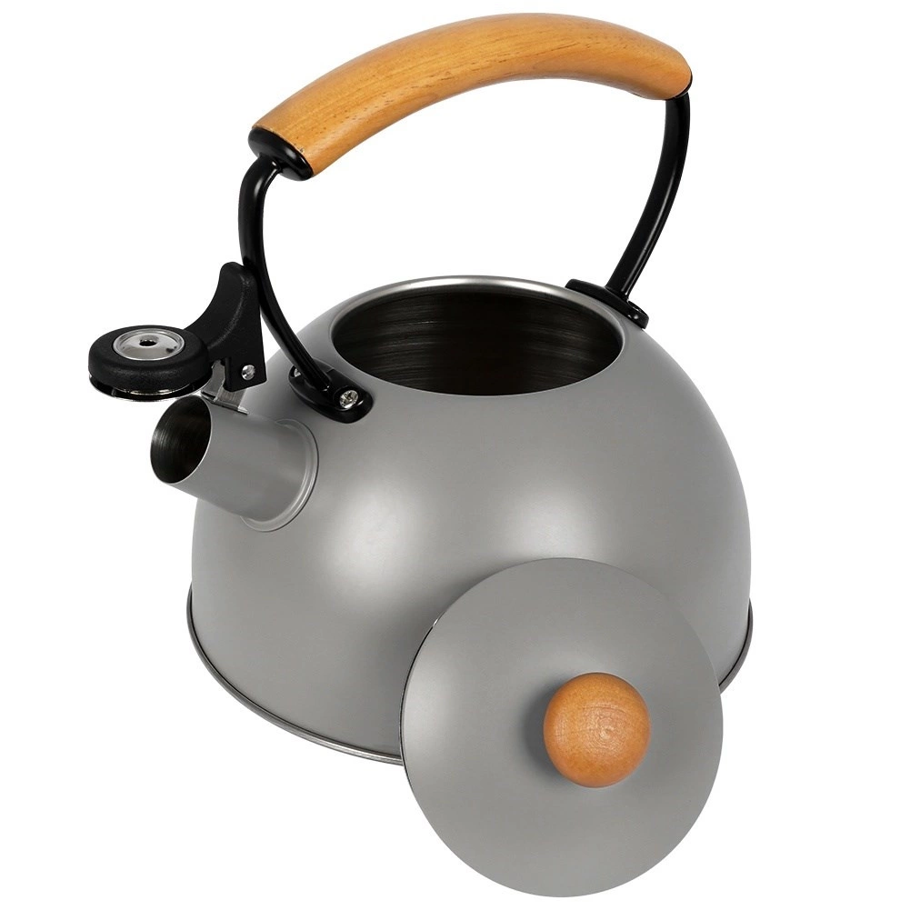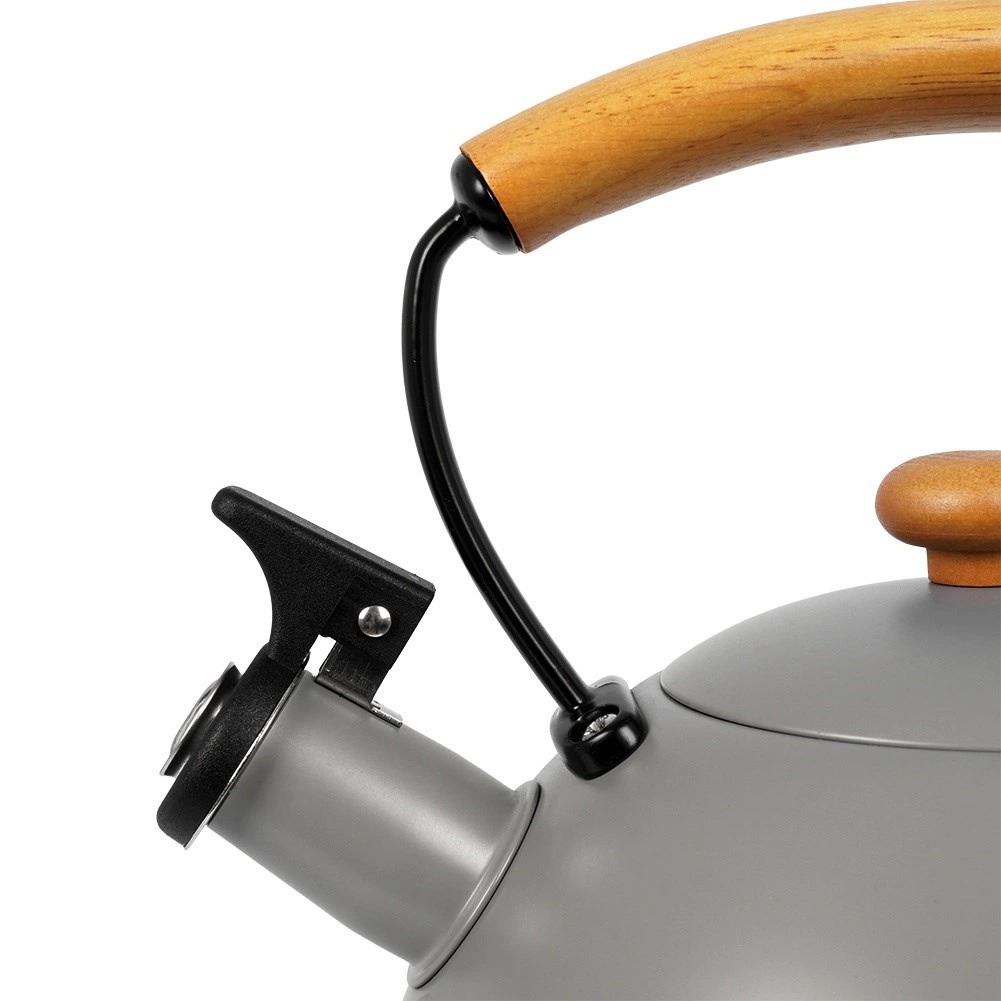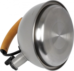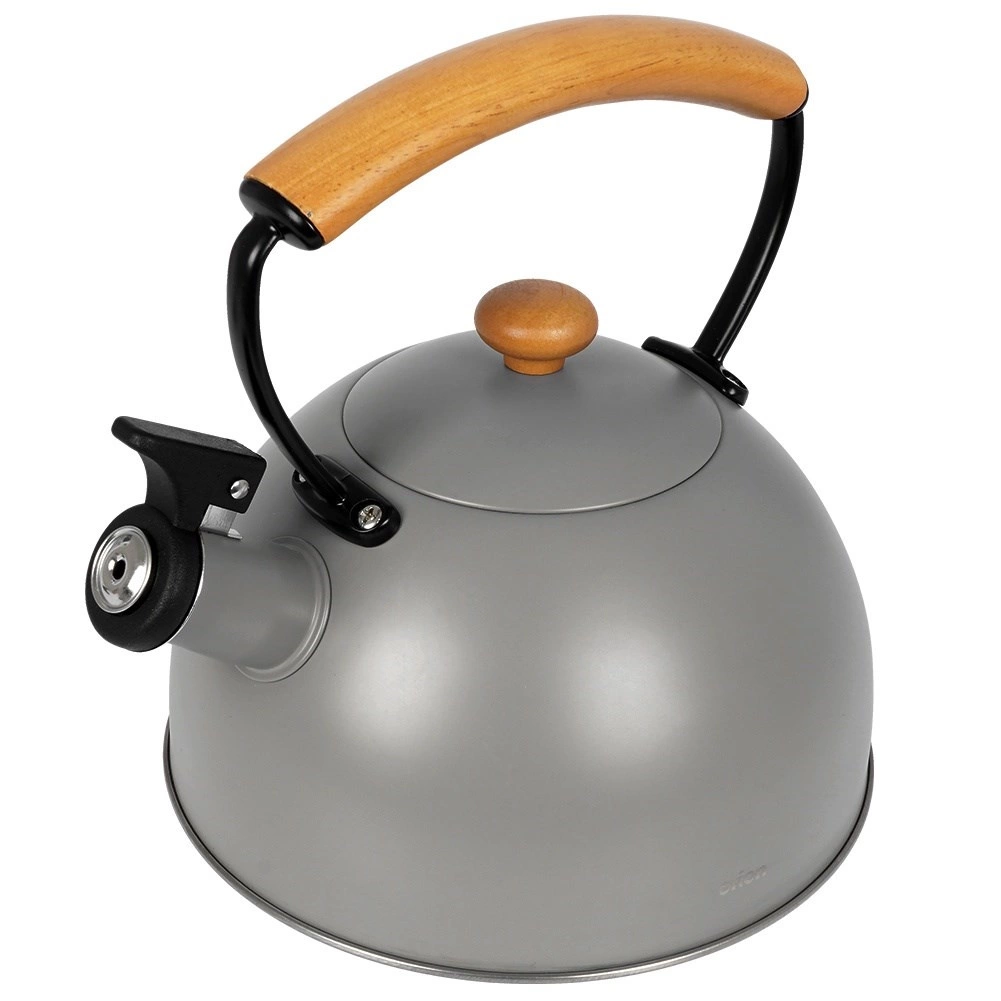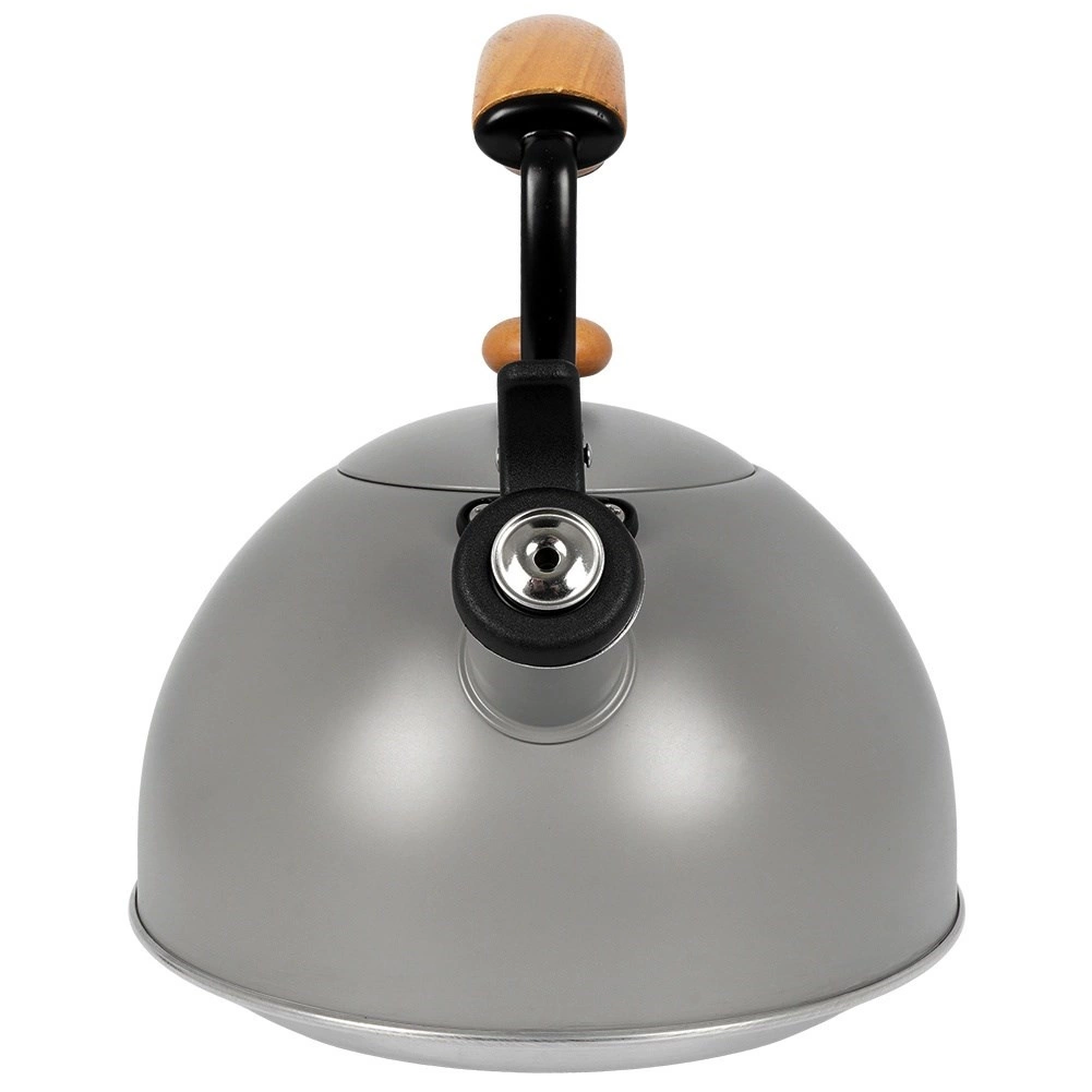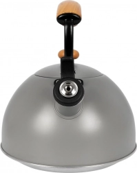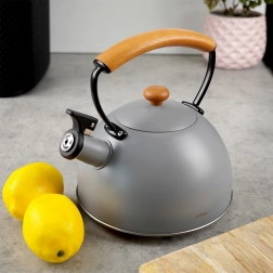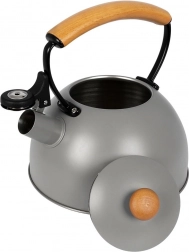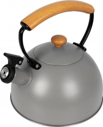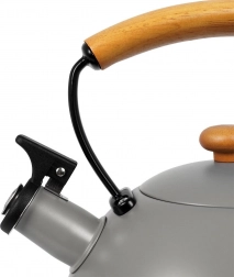 Bouilloire en inox haut de gamme en finition grise avec éléments en bois d’hévéa, idéale pour porter rapidement l’eau à ébullition pour le café, le thé ou les infusions. Grâce à la poignée ergonomique en bois et au sifflet rabattable, la manipulation est sûre et confortable. La bouilloire est économe en énergie et l’inox ne modifie pas le goût de l’eau.