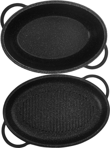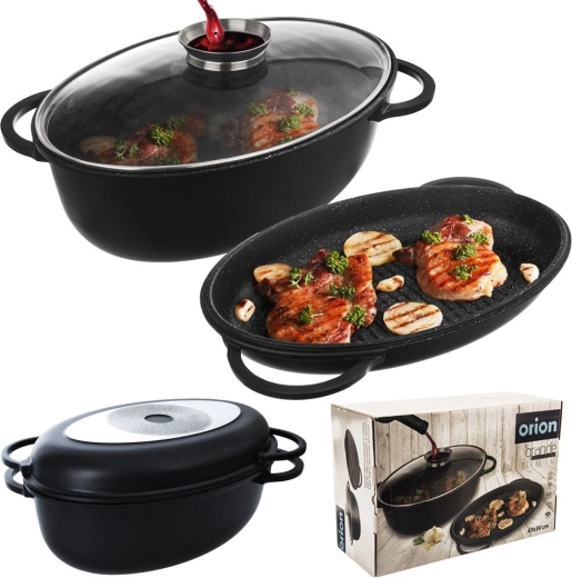 Ensemble ovale universel 3-en-1 pour rôtir, mijoter et griller. Aluminium moulé robuste avec double revêtement antiadhésif granit PFLUON GRANIT permettant de cuisiner avec un minimum de matière grasse. Couvercle en verre avec doseur de liquides pour arroser facilement sans soulever le couvercle. Compatible avec l’induction, le gaz, l’électricité, la vitrocéramique et le four. Nettoyage facile au lave-vaisselle.