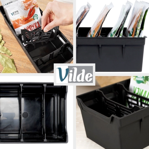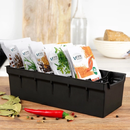 Grâce aux cinq séparateurs, vous triez rapidement vos épices par type ou usage – herbes, épices moulues, mélanges, ingrédients pour pâtisserie, etc. Idéal pour tiroirs et étagères, pour sachets ouverts comme fermés. La finition noire élégante s’intègre à toute cuisine et aide à maintenir ordre et clarté.