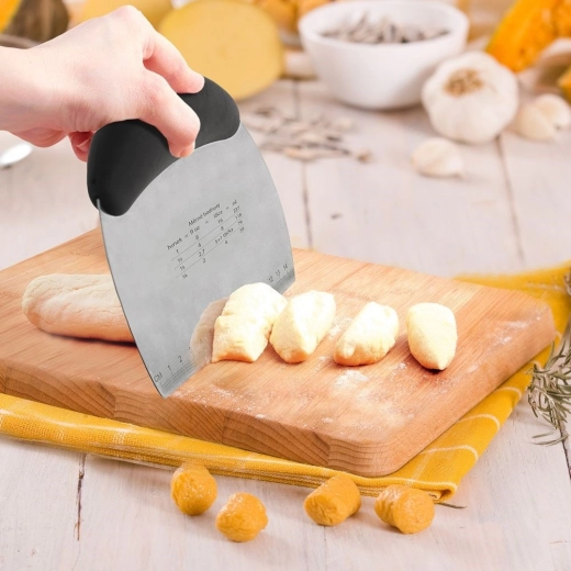 Cette spatule multifonction combine raclette, hachoir et coupe-pâte en un seul outil. Elle est parfaite pour travailler les pâtes, crèmes et fondants et facilite le transport, le portionnement et la mise à niveau des surfaces. Grâce au bord tranchant, vous hachez facilement noix, oignons ou légumes.