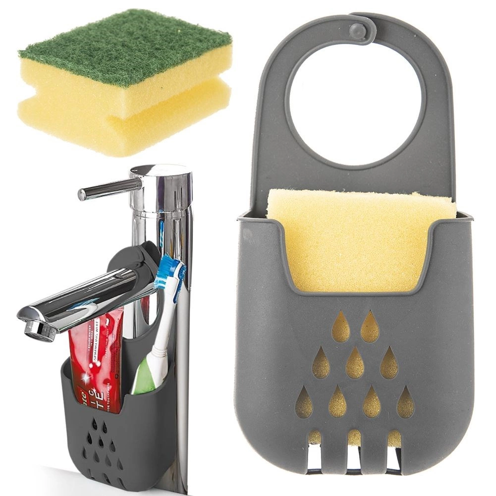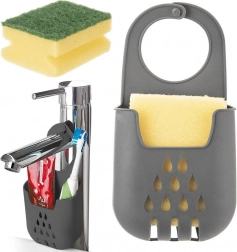 Organisez intelligemment l’espace autour de l’évier. Le porte-éponge suspendu se fixe directement sur la robinetterie, économisant de la place sur le plan de travail et gardant les accessoires de nettoyage au même endroit. Les trous d’évacuation assurent l’écoulement de l’eau, un séchage rapide et une meilleure hygiène.