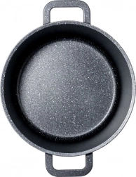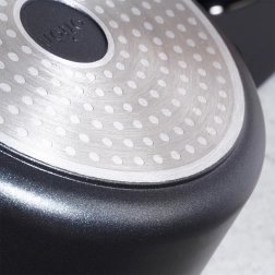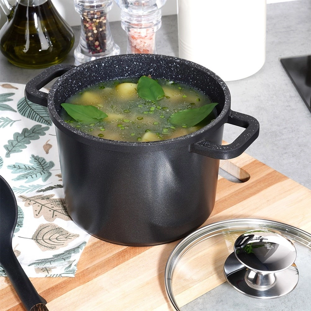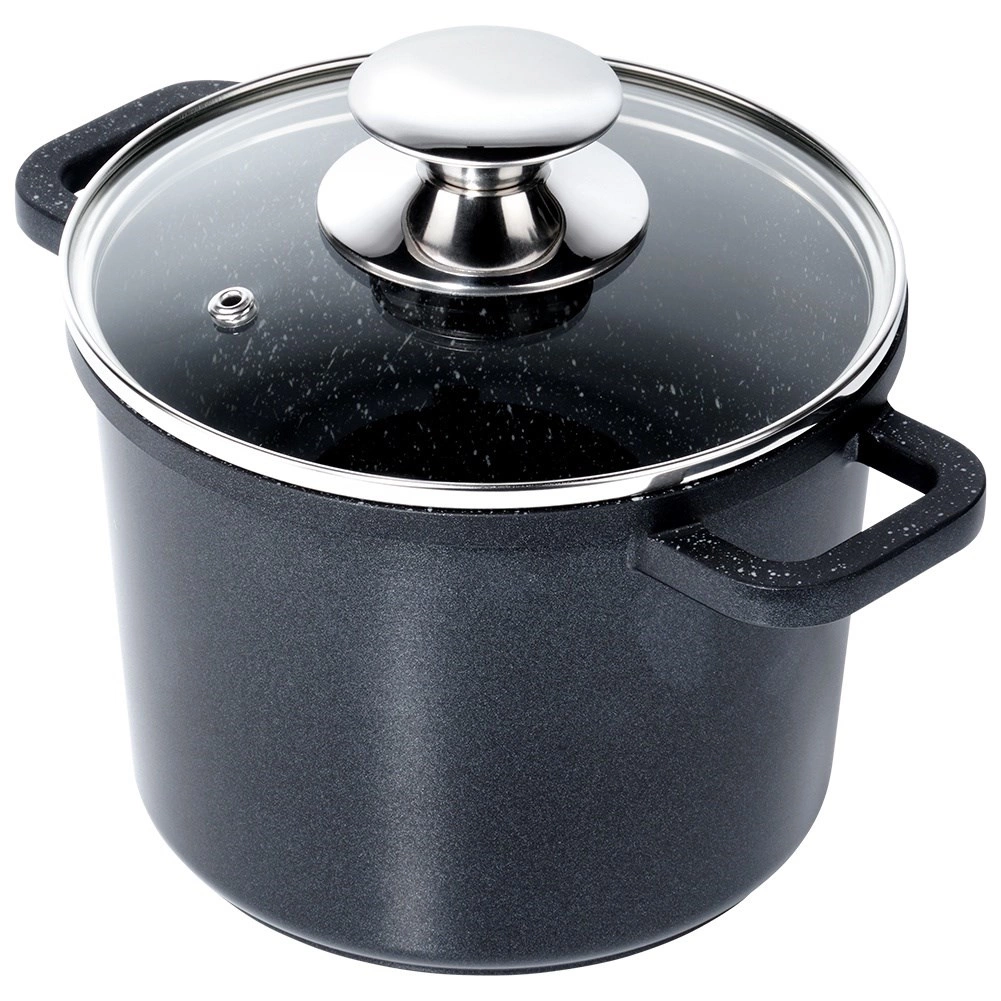 Élégante marmite en aluminium noir avec revêtement intérieur granit antiadhésif PFLUON qui empêche les aliments de brûler, facilite l’entretien et préserve le goût naturel ainsi que les nutriments. Le couvercle en verre avec orifice steam vent permet de contrôler la cuisson sans le soulever inutilement.