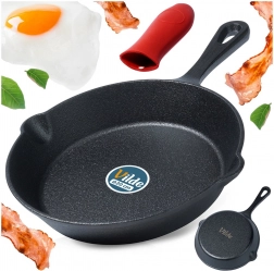 La conception entièrement en fonte assure une excellente conduction et accumulation de chaleur. Les aliments cuisent de manière homogène, avec une croûte parfaite et un cœur juteux.