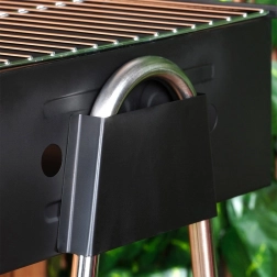 Des matériaux résistants assurent une longue durée de vie : le corps en acier avec revêtement en peinture poudrée résiste aux hautes températures et aux intempéries, tandis que la grille chromée est facile à entretenir et amovible pour un nettoyage rapide.