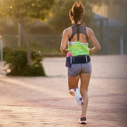Les détails réfléchissants améliorent la visibilité lors des courses au crépuscule. La sangle élastique et réglable (85–110 cm) avec boucle maintient la ceinture bien en place.