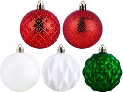 Élégant ensemble de 35 décorations de Noël incassables aux couleurs rouge, vert et blanc avec différentes finitions – brillant, mat, pailleté, en relief. Des boules de 6 cm de diamètre qui embelliront en toute sécurité votre sapin, vos couronnes et guirlandes, et créeront une ambiance de Noël féerique. Des ficelles de suspension sont incluses.