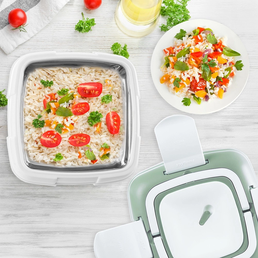 Assez d’espace pour le plat principal et l’accompagnement. Parfait pour transporter les déjeuners au travail, à l’école ou en voyage.
