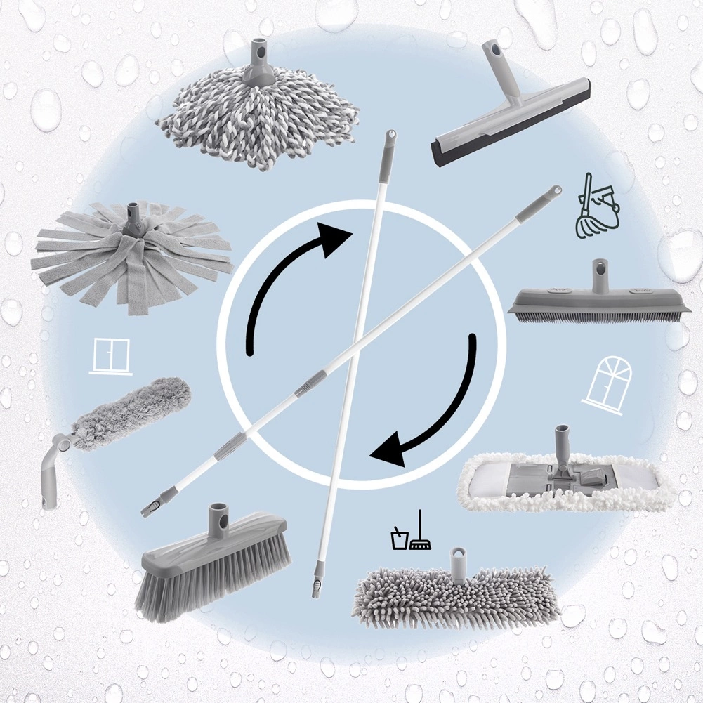 Le filetage universel et la fixation click assurent la compatibilité avec les mops, balais et brosses, pour un changement d’accessoires rapide.