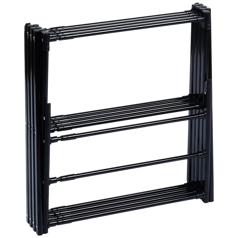 Séchoir à linge vertical compact et stable avec extension télescopique 43–75 cm, 14 tiges et capacité de charge jusqu’à 10 kg. Sa structure métallique résistante avec revêtement époxy de couleur noire convient à l’intérieur comme à l’extérieur. Grâce à sa conception multi-niveaux, vous optimisez l’espace et obtenez jusqu’à 10 m de surface de séchage.