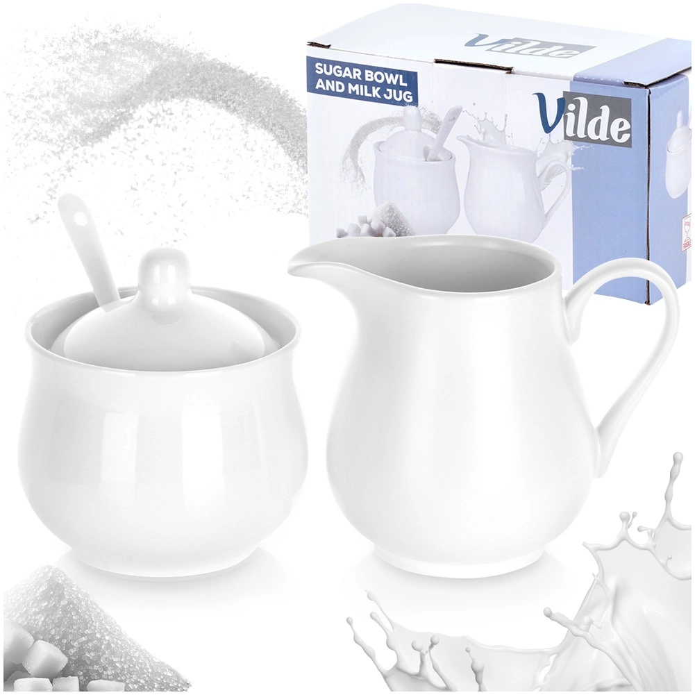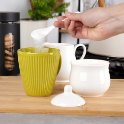 Élégant set 3 pièces en porcelaine pour servir le café et le thé : crémier 250 ml avec anse confortable et bec verseur précis, sucrier 230 ml avec couvercle et cuillère. Blanc intemporel, forme moderne et détails pratiques – idéal pour la maison comme pour la restauration. Compatible lave-vaisselle.