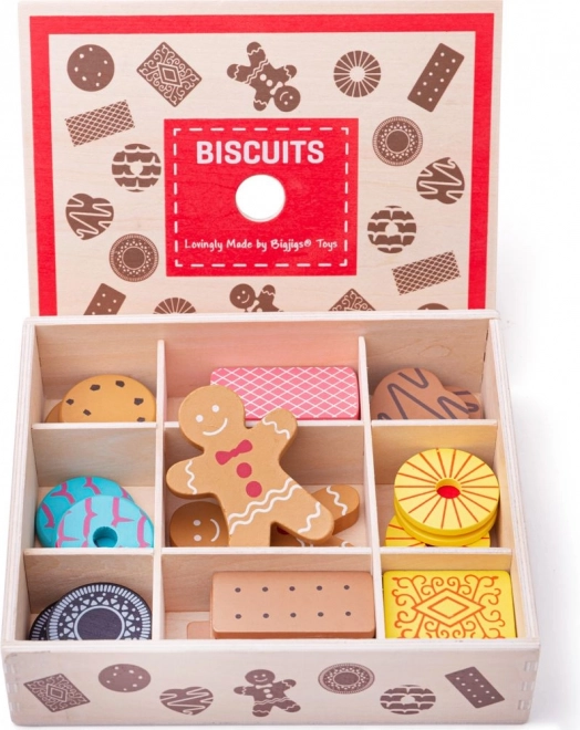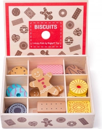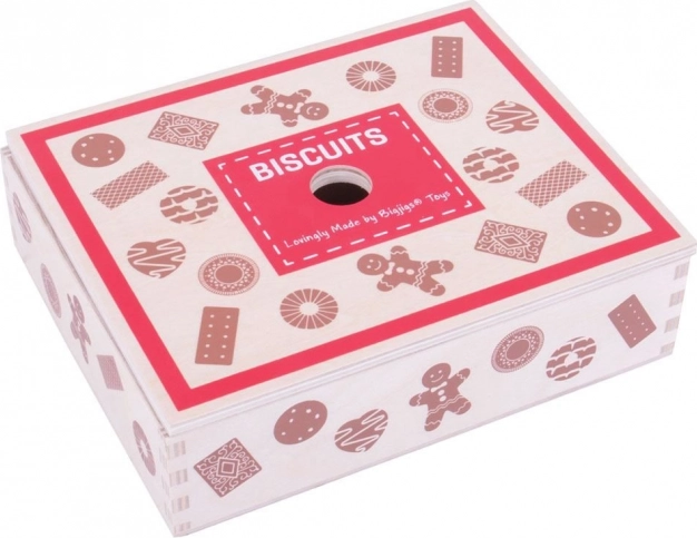 Découvrez la boîte en bois avec jouets biscuits, qui contient un assortiment de biscuits préférés, y compris des biscuits au gingembre et d'autres délices. Cet ensemble permet aux petits de développer leur créativité à travers un jeu inspiré par la pâtisserie.